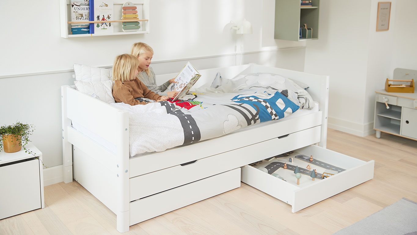Στο χαμηλό κρεβάτι μπορείς να ξεκινήσεις με μια απλή μορφή μόνο με τα κεφαλάρια ή να διαλέξεις το στυλ και το χρώμα των προστατευτικών αλλά και να προσθέσεις συρόμενο κρεβάτι, συρτάρια αποθήκευσης ή και τα δύο!