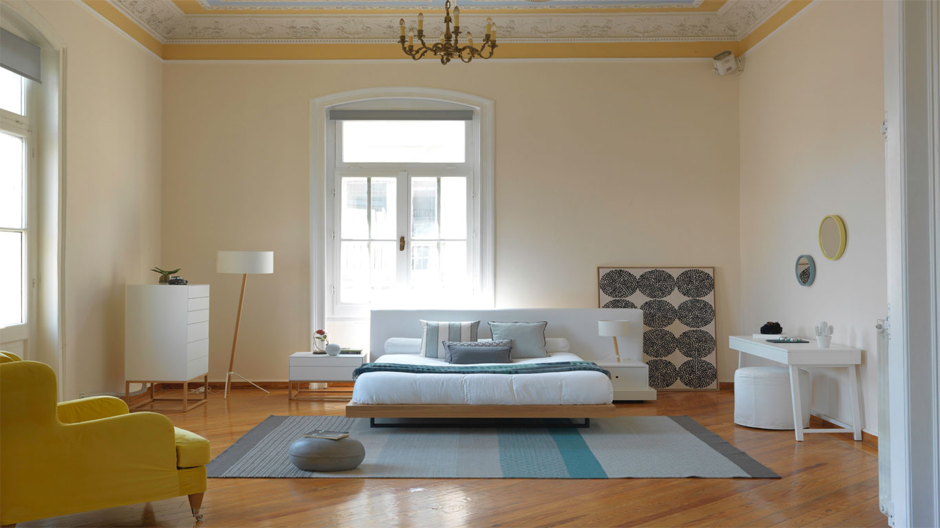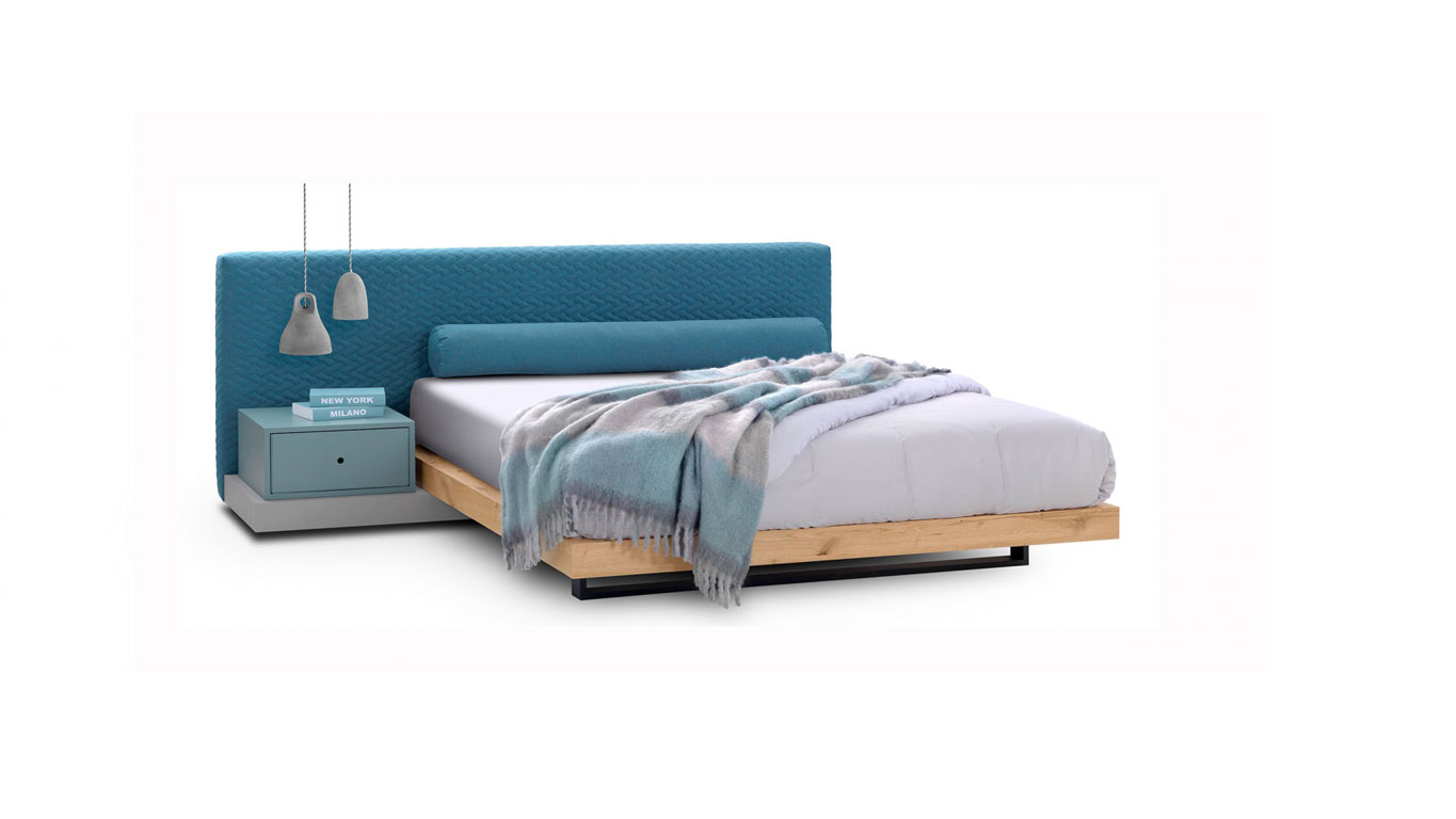- Wooden base with headboard in fabric.
