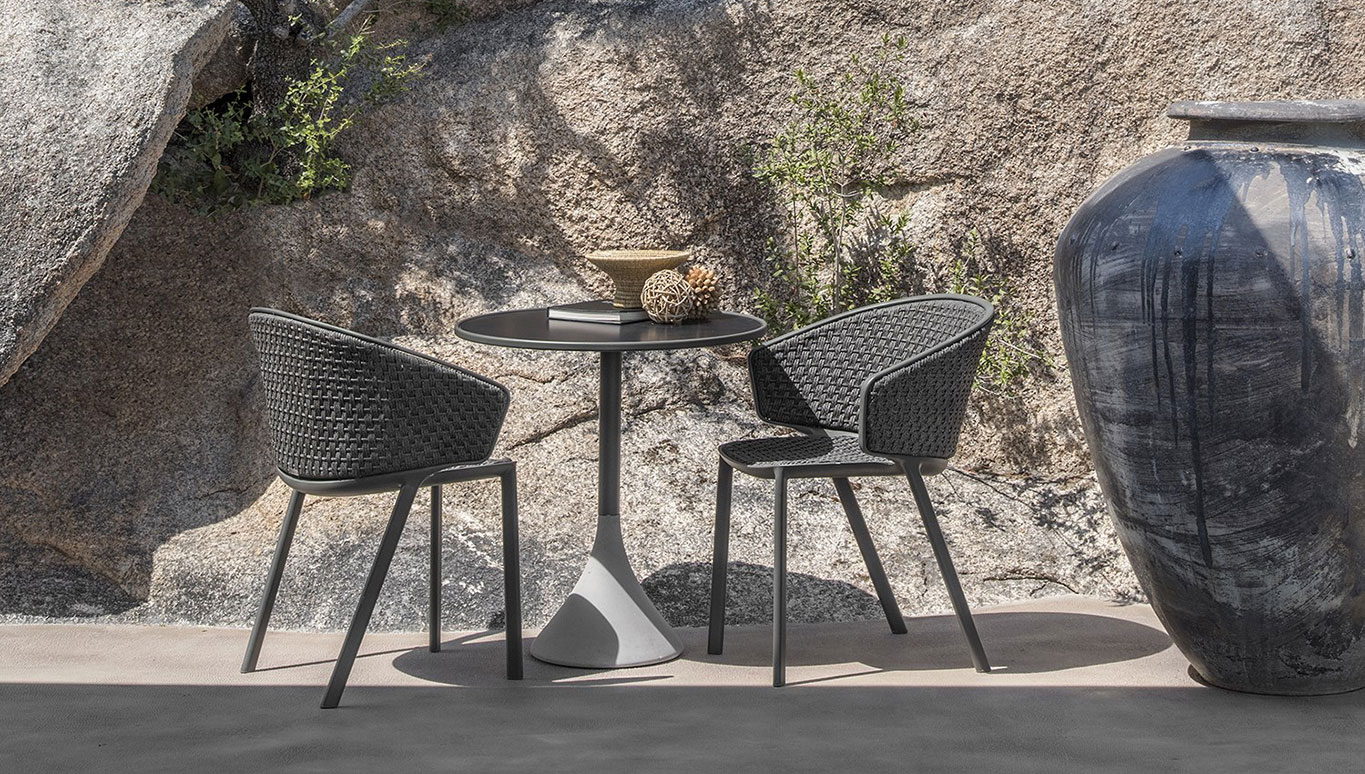 Η άνετη και εκλεπτυσμένη πολυθρόνα Pluvia συνδυάζει αρμονικά το σκελετό αλουμινίου με το πλεκτό σχοινί
