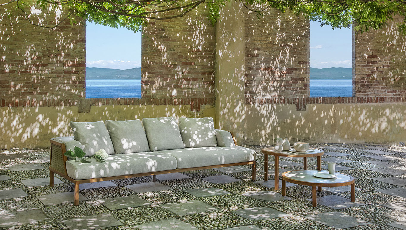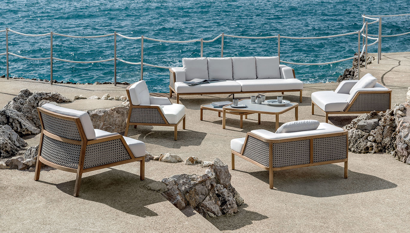 The pickled or natural teak structure with metal core is covered with large cushions that welcome the body with a feeling of deep and enveloping comfort.