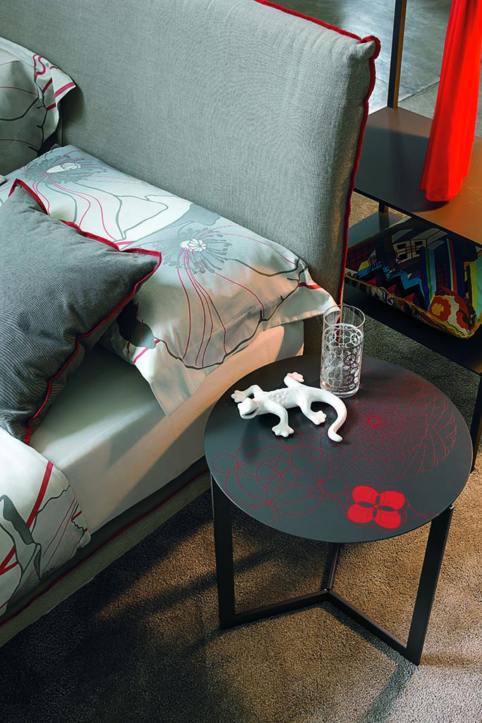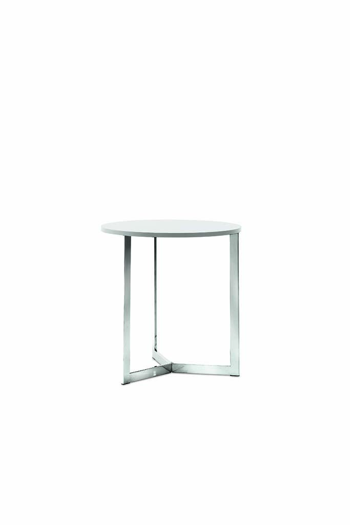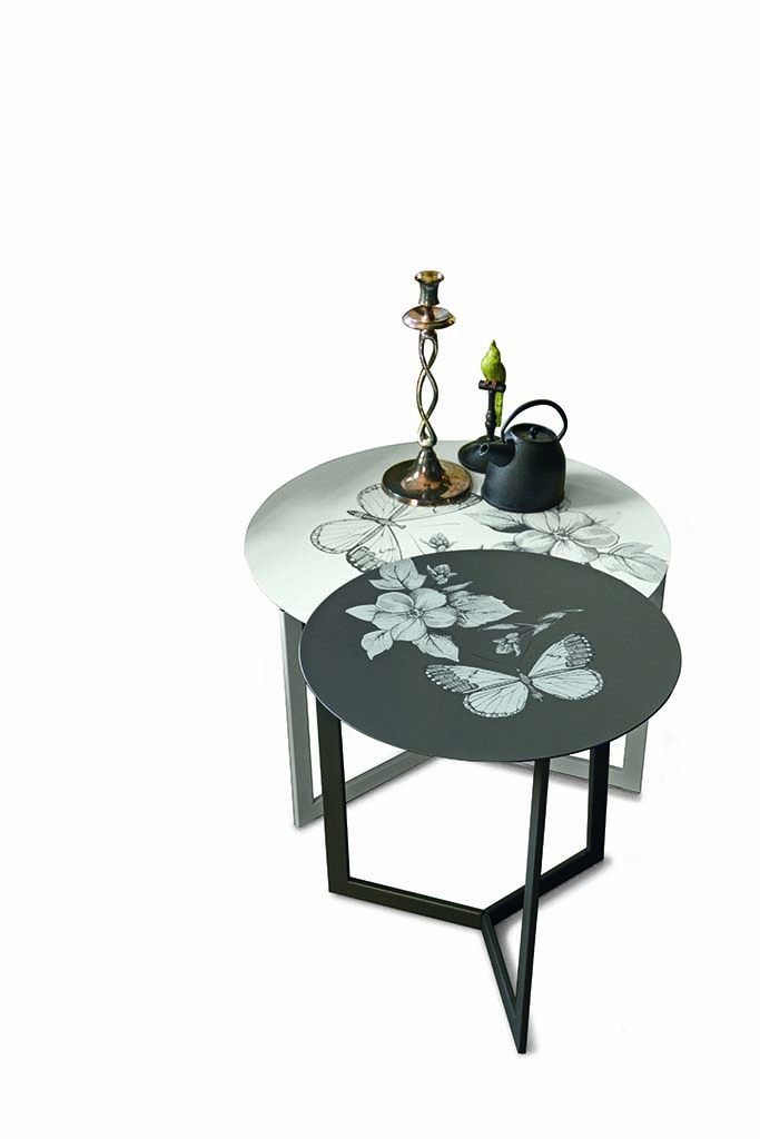 Round screen-printed occasional table for living rooms.