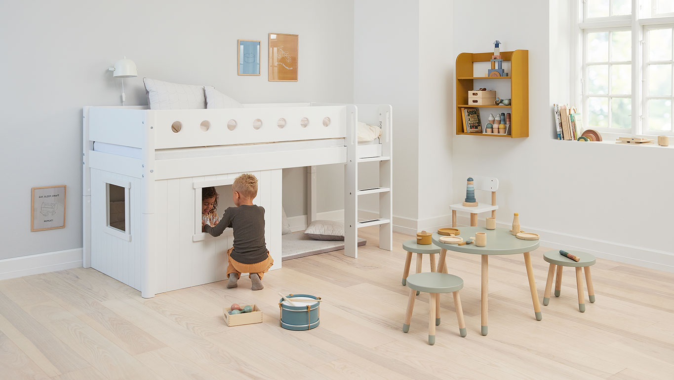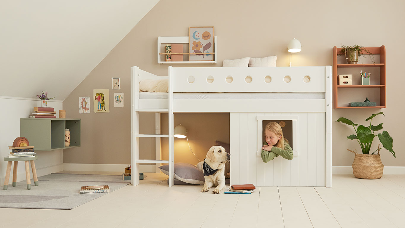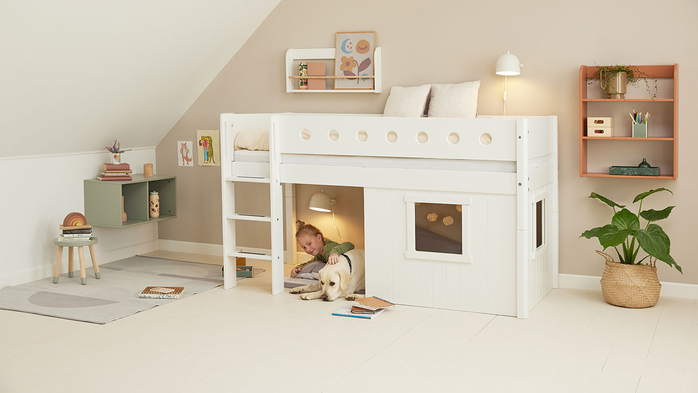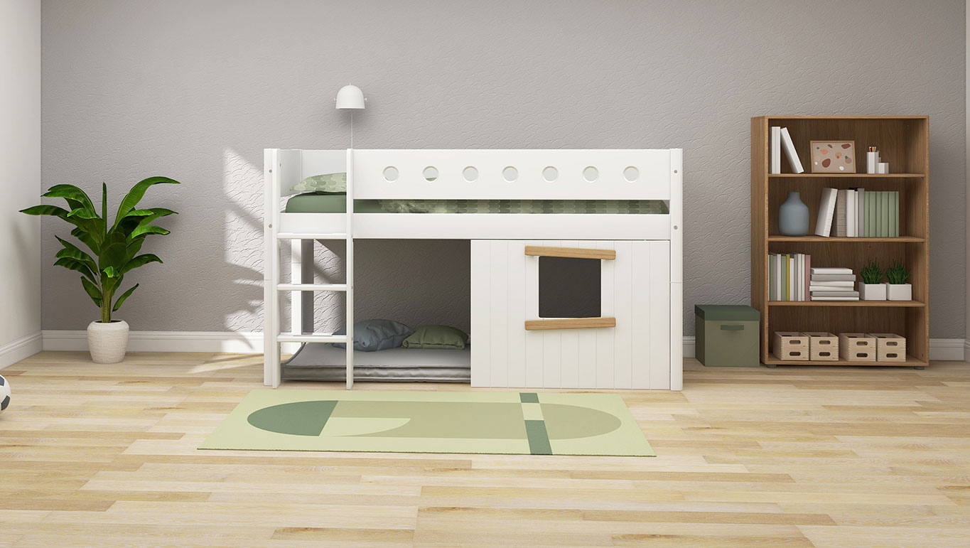 White mid-high bed with Treehouse Bed Fronts is designed to support your child’s need for sleep, play, and development – all at the same time.